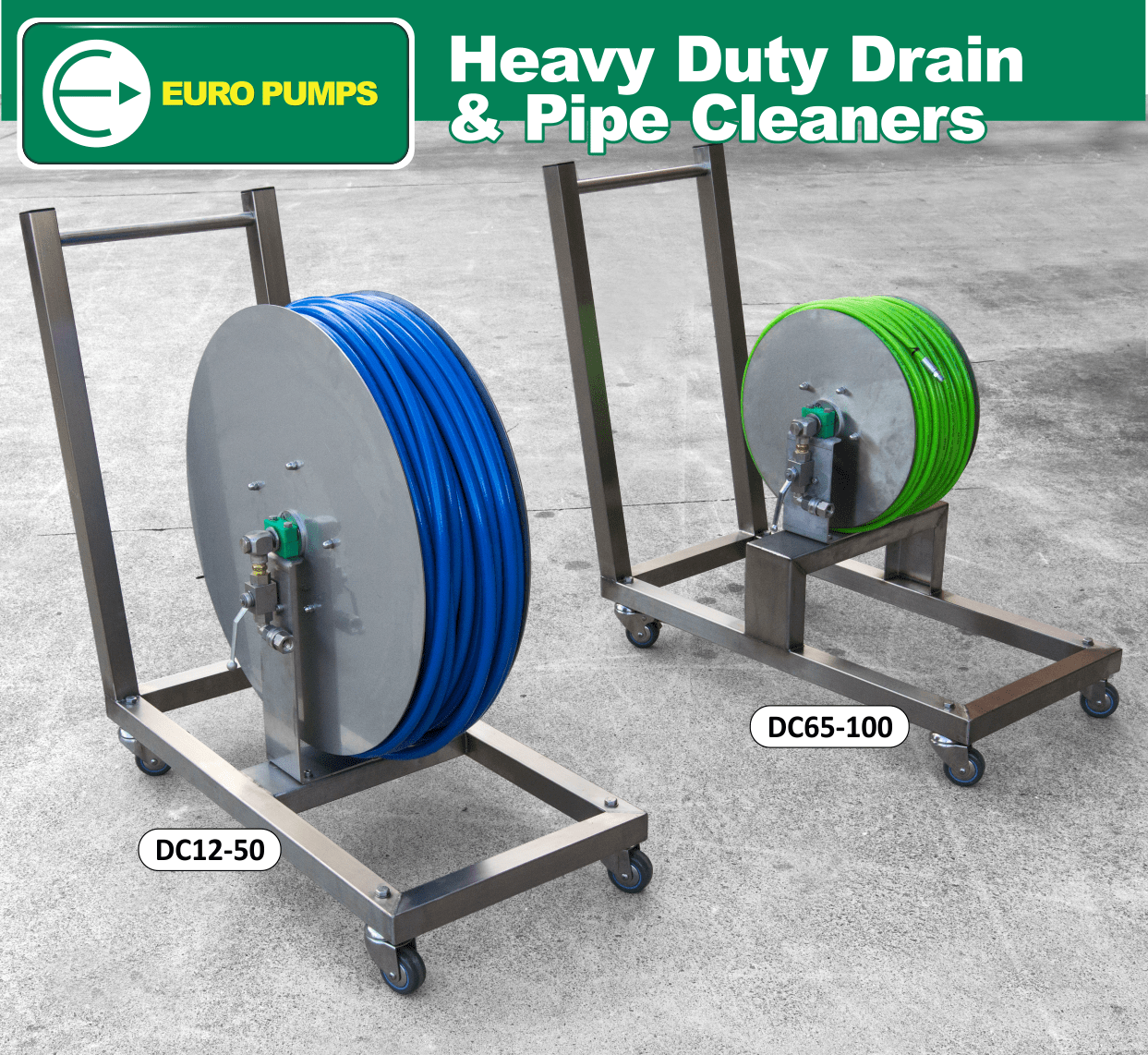 Euro Pumps New heavy duty drain cleaner on a solid stainless frame, with locking handle, infeed swivel & ball valve shut off. It’s available in ½ and 1/4 inch in your choice of 25, 33, 50 75 & 100m lengths.